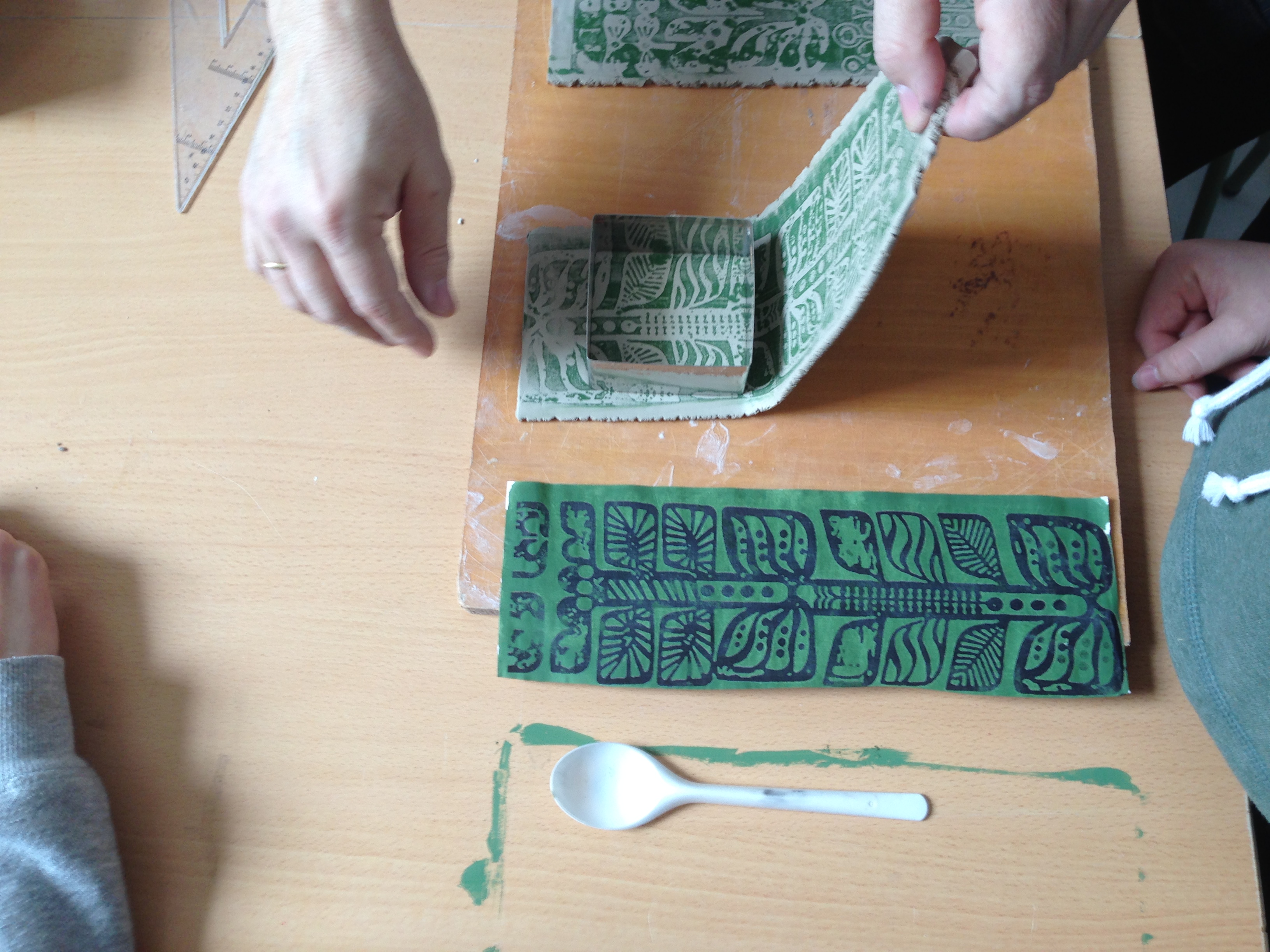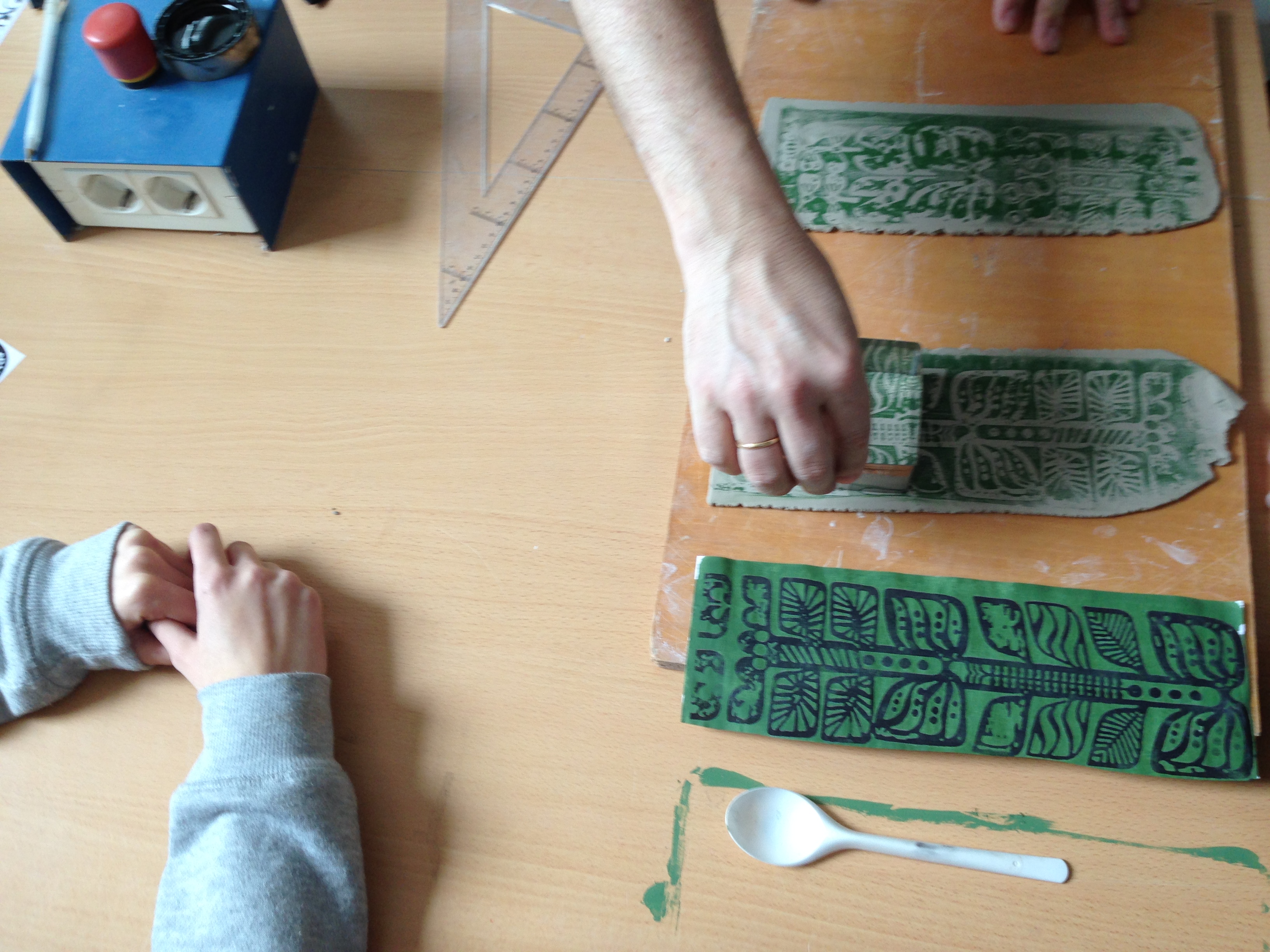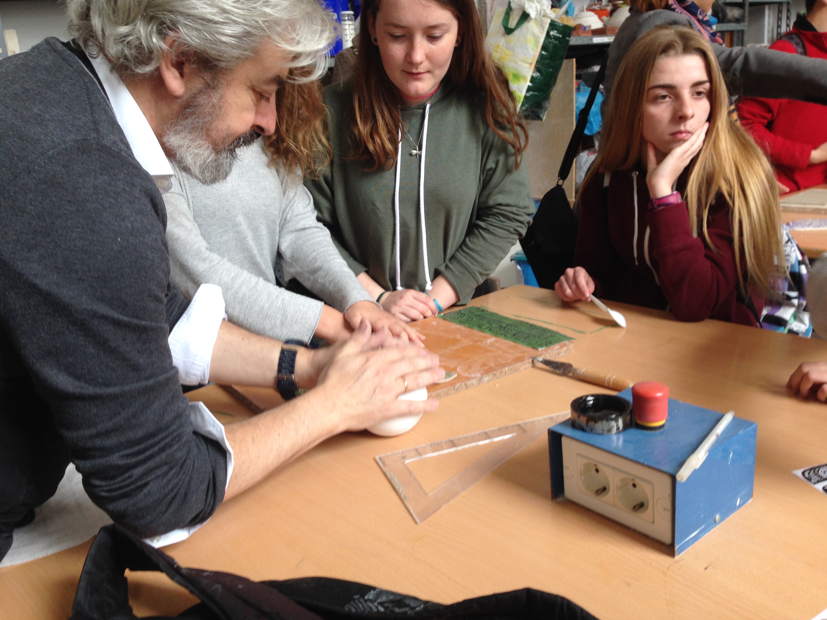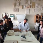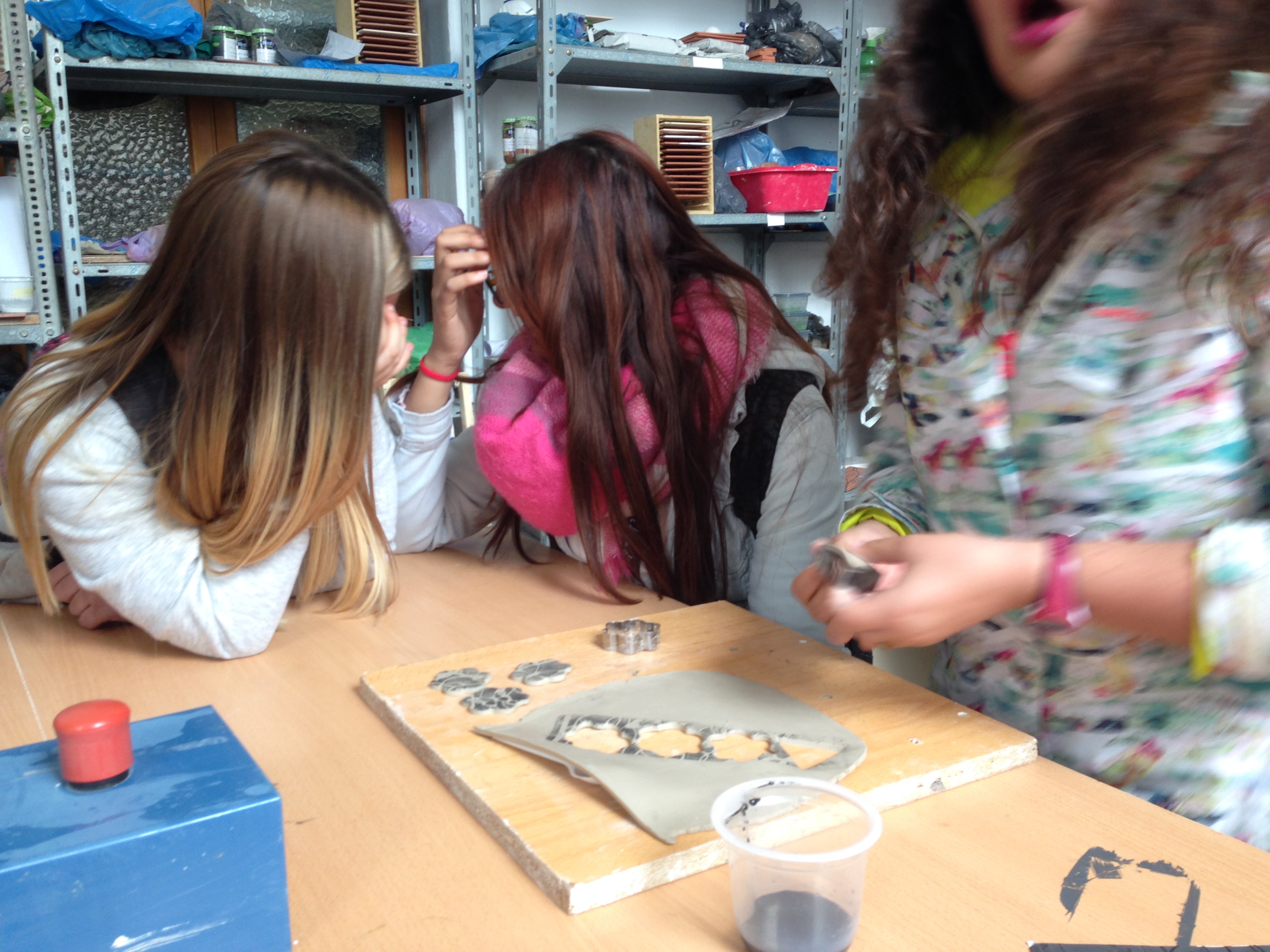 Descripción: Muestra del taller y explicación los trabajos que se están haciendo. Taller de impresión sobre arcilla.