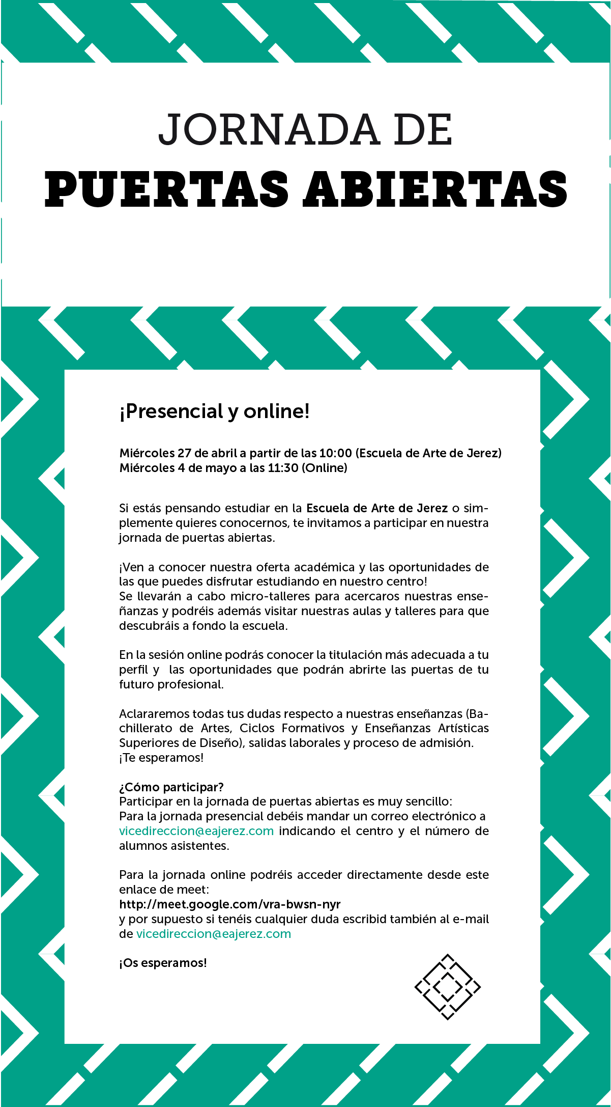 ¡Participa en las jornadas de puertas abiertas de la escuela 21-22! Categorías Novedades Fecha abril 5, 2022 Para conectarte, puedes pinchar aquí o en la imagen. Compartir: Escuela de Arte de Jerez Publicación anterior Video - Yo elijo la Escuela de Arte de Jerez abril 5, 2022 Siguiente publicación Admisión Ciclos Formativos 2022-23 abril 26, 2022 También te puede interesar Aula1_Abraham Zambrana 27 octubre, 2025 Aula1_Ilustradoras 13 mayo, 2025 Admisiones CFGS 1 mayo, 2025